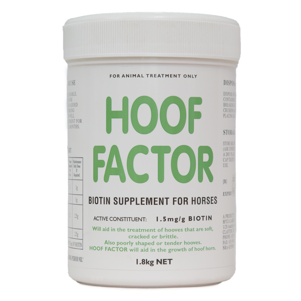 Highly palatable oral supplement to aid the growth of hoof horn. For use as an aid in the management of hooves that are soft, cracked, brittle, poorly shaped or tender. Each scoop of Hoof Factor contains 7.5mg Biotin.